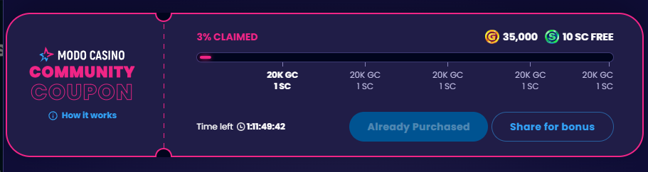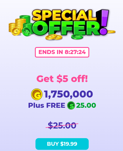 20 free spins (20 x 0.25 SC) with $20 purchase